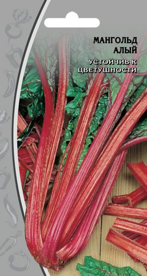МАНГОЛЬД АЛЫЙ Устойчив к цветушности Холодостойкий среднеспелый (80–90 дней) сорт. Листья крупные, удлиненно-овальной формы, фиолетово-зеленые со слабопузырчатой поверхностью, длиной 23–25 см, шириной 16–17 см. Черешки малиново-красные, длиной 25–27 см. Урожайность до 5 кг/кв. м. Ценность сорта: высокая урожайность, устойчивость к цветушности, повышенное содержание витаминов, каротина, минеральных солей, белка, сахаров. Используют в свежем виде как салатную зелень и в кулинарии, черешки маринуют.